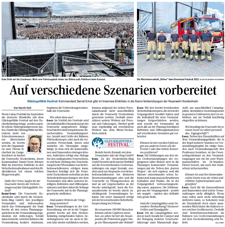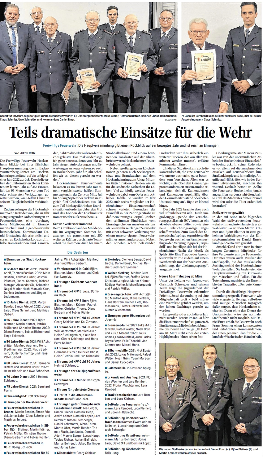 Freiwillige Feuerwehr Die Freiwillige Feuerwehr Hockenheim blickte bei ihrer jährlichen Hauptversammlung, die im Baden-Württemberg-Center am Hockenheimring stattfand, auf ein erfolgreiches Jahr 2022 zurück. Durch die Arbeit der uniformierten Helfer konnten im letzten Jahr auf 353 Einsatzfahrten 96 Menschen vor dem Tod oder schwersten Verletzungen gerettet werden, wie Steffen .....