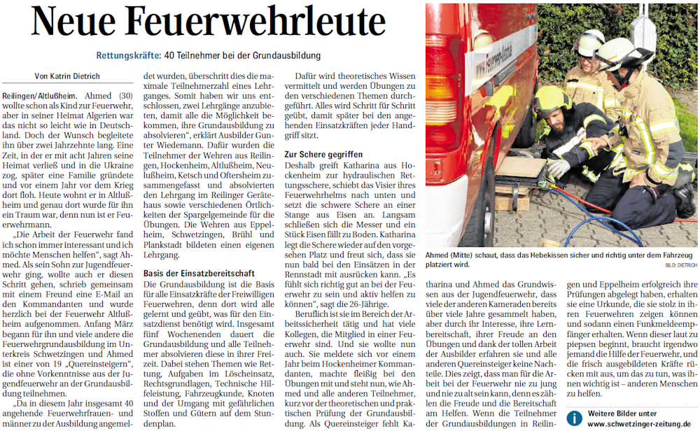 Rettungskräfte: Ahmed (30) wollte schon als Kind zur Feuerwehr, aber in seiner Heimat Algerien war das nicht so leicht wie in Deutschland. Doch der Wunsch begleitete ihn über zwei Jahrzehnte lang. Eine Zeit, in der er mit acht Jahren seine Heimat verließ und in die Ukraine zog, später eine Familie gründete und vor einem Jahr vor dem Krieg dort floh. Heute wohnt er in Altlußheim und ....