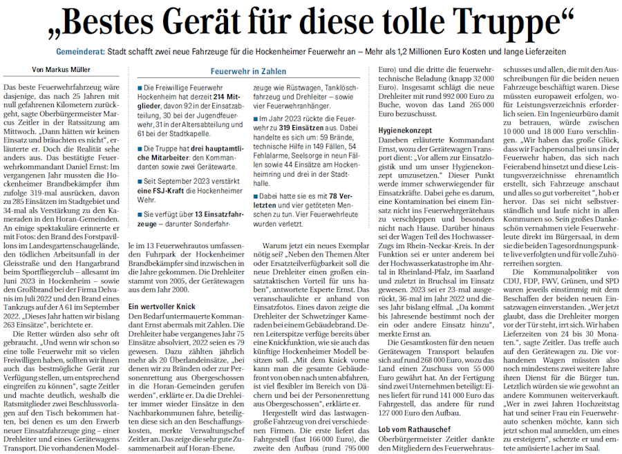 Gemeinderat: Das beste Feuerwehrfahrzeug wäre dasjenige, das nach 25 Jahren mit null gefahrenen Kilometern zurückgeht, sagte Oberbürgermeister Marcus Zeitler in der Ratssitzung am Mittwoch. „Dann hätten wir keinen Einsatz und bräuchten es nicht“, erläuterte er. Doch die Realität sehe anders aus. Das bestätigte Feuerwehrkommandant Daniel Ernst: Im vergangenen Jahr mussten die Hockenheimer Brandbekämpfer ...