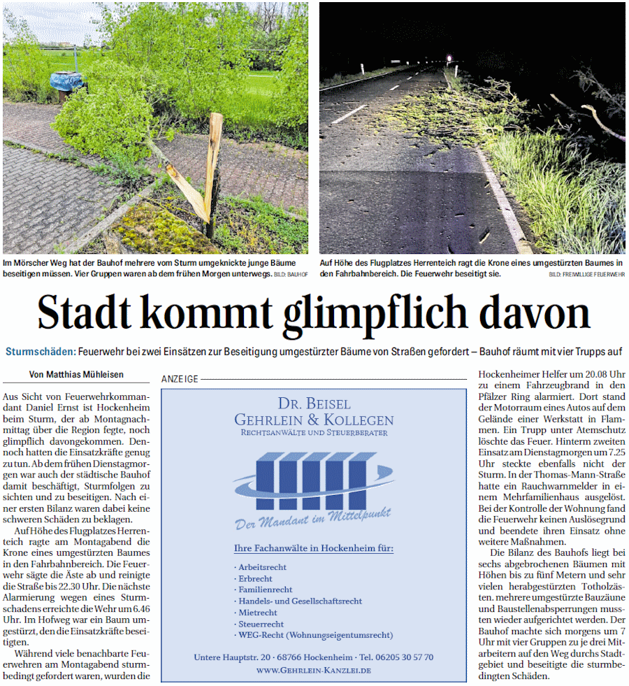 fegte, noch glimpflich davongekommen. Dennoch hatten die Einsatzkräfte genug zu tun. Ab dem frühen Dienstagmorgen war