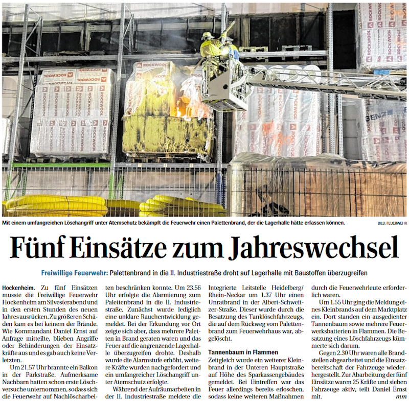 Freiwillige Feuerwehr: Zu fünf Einsätzen musste die Freiwillige Feuerwehr Hockenheim am Silvesterabend und in den ersten Stunden des neuen Jahres ausrücken. Zu größeren Schäden kam es bei keinem der Brände. Wie Kommandant Daniel Ernst auf Anfrage mitteilte, blieben Angriffe oder Behinderungen der Einsatzkräfte aus und es gab auch keine Verletzten. Um 21.57 Uhr brannte ein Balkon ....